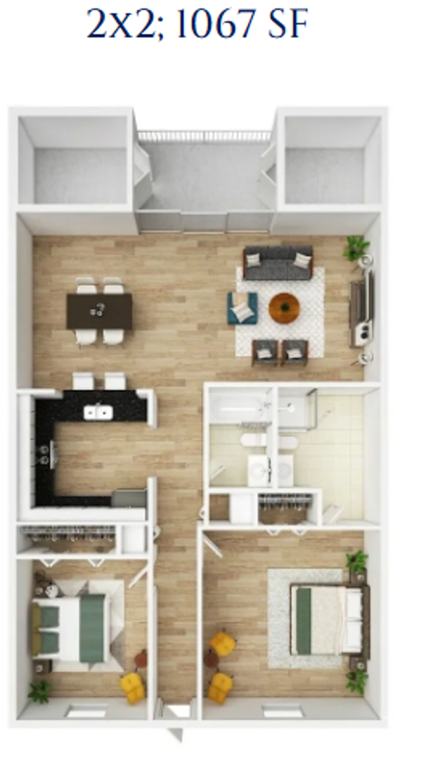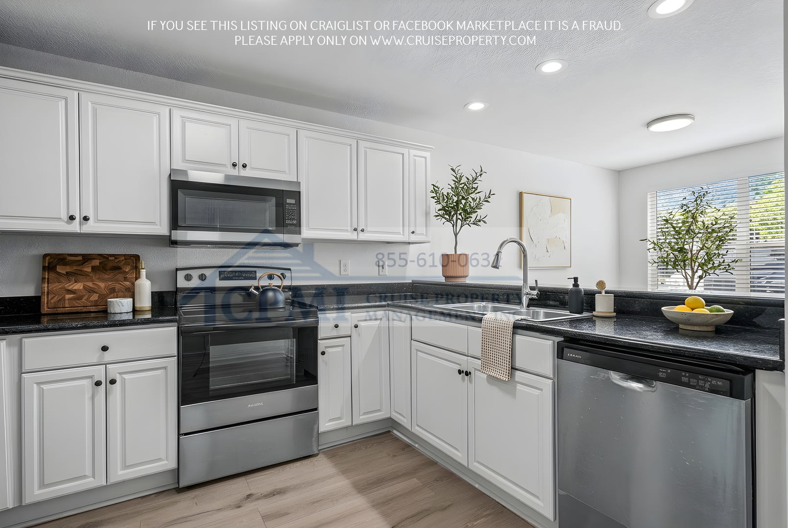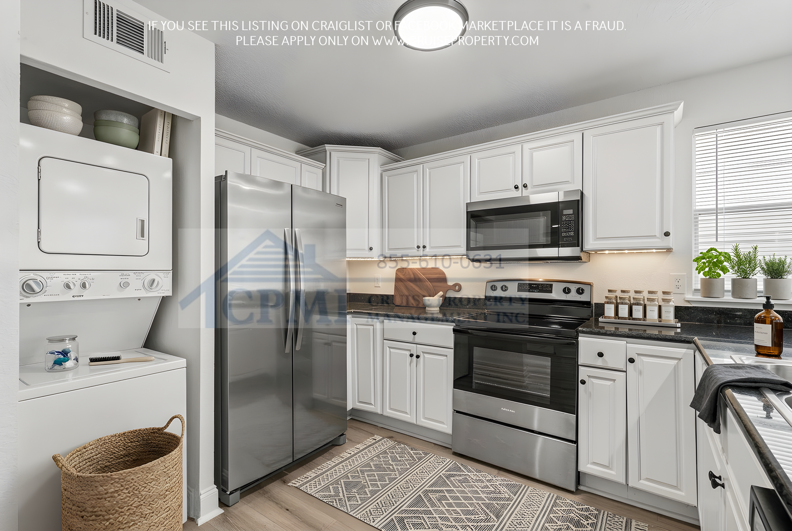 Each residence features a bright and open floor plan designed for both comfort and functionality. The bedrooms include spacious closets, while the kitchen is appointed with granite countertops and stainless-steel appliances. Additional features include a private washer and dryer, private balconies, and a combination of tile and laminate flooring throughout the unit.